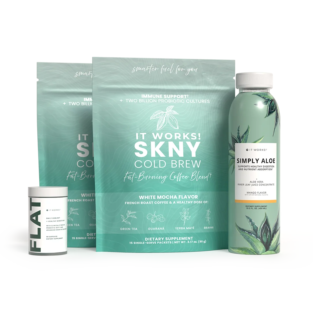 Kickstart your days with our Morning Trio for immune support, enhanced hydration, and a powerful probiotic. Skinny Cold Brew fires up your focus and metabolism in a delicious White Mocha flavor you’ll love, while IT WORKS! Simply Aloe ensures that you start your morning hydrated. FLAT adds support for your daily gut health with its clinically proven DE111 probiotic.